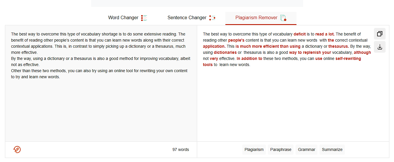 In this screenshot, you can see how the tool changed the content by altering the sentence structures and also synonymizing it. For one, the word 'shortage' was changed to 'deficit'. (It’s not the best replacement, but it works.)